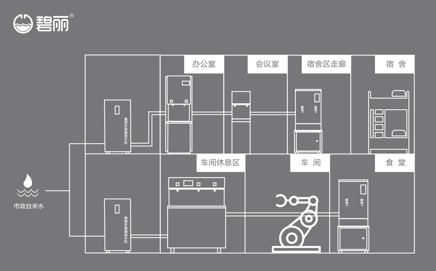 碧麗商用反滲透純水機(jī)將自來水集中處理后,把優(yōu)質(zhì)的純凈水通過專用的供水管道輸送到各飲水點(diǎn);