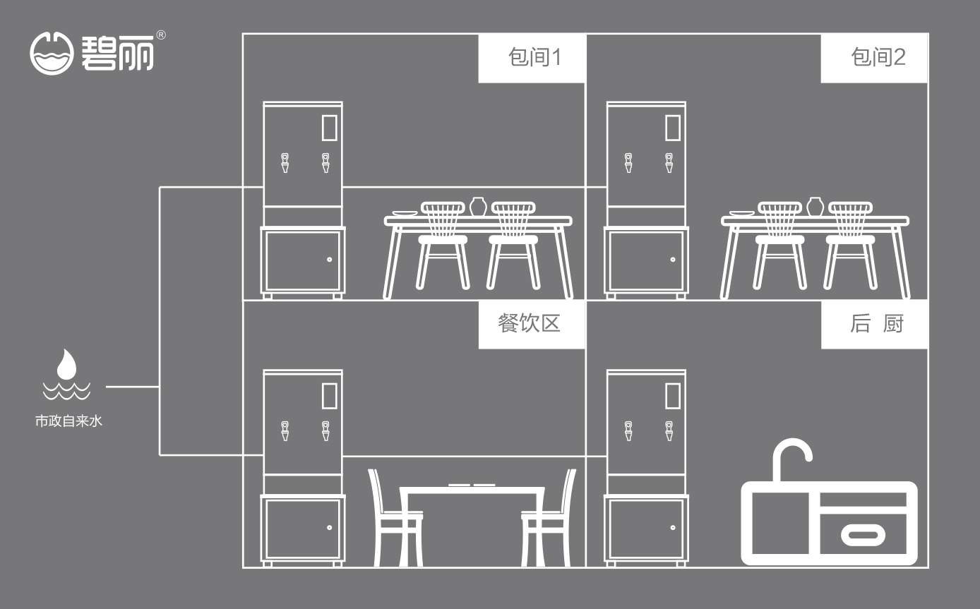 售后維護、更換濾芯方便,解決因場地限制無法滿足同時供應(yīng)多個飲水點的難題;